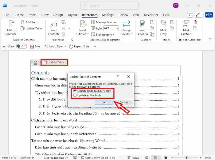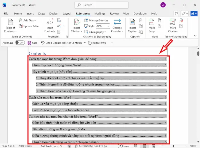 *Mẹo hay: Bạn nên thực hiện việc cập nhật mục lục cuối cùng sau khi hoàn tất chỉnh sửa để tránh nhầm lẫn số trang.