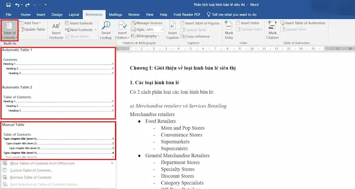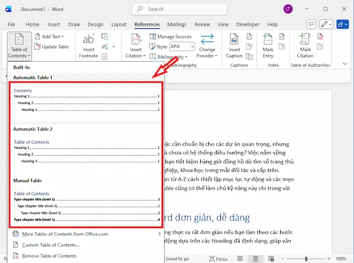 – Bước 4: Chọn một mẫu mục lục mà bạn muốn (ví dụ Automatic Table 1) – Word sẽ tự động liệt kê tất cả các Heading trong văn bản cùng số trang tương ứng.