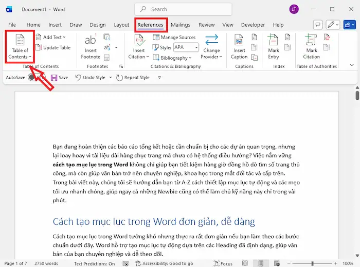 Word cung cấp tính năng mục lục tự động, giúp bạn nhanh chóng liệt kê tất cả các tiêu đề trong văn bản cùng số trang tương ứng. Chỉ với vài cú nhấp chuột, bạn đã có ngay một mục lục gọn gàng, chuyên nghiệp và có thể cập nhật tự động khi chỉnh sửa nội dung.