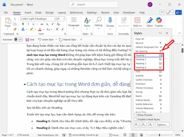 Cách tạo mục lục trong Word bắt buộc người dùng phải làm quen với hệ thống Heading (Tiêu đề phân cấp) – nền tảng của việc soạn thảo văn bản quy chuẩn. Khi gán Heading 1, Heading 2, Heading 3…, cũng tức là bạn đang xây dựng một “bộ khung’ vững chắc cho tài liệu.