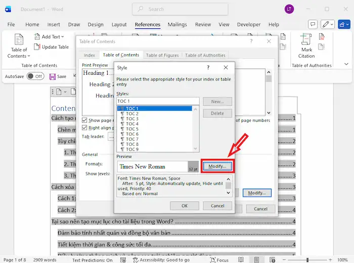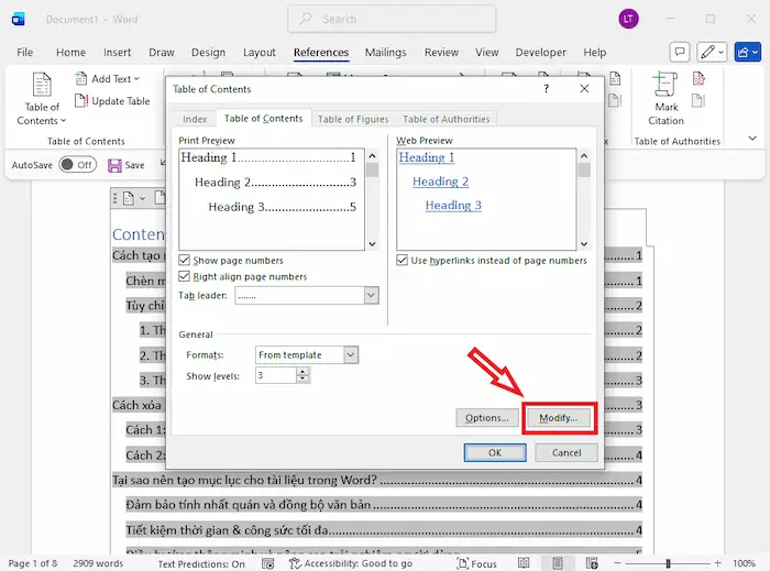 – Bước 3: Trong cửa sổ Table of Contents, nhấn chọn Modify…