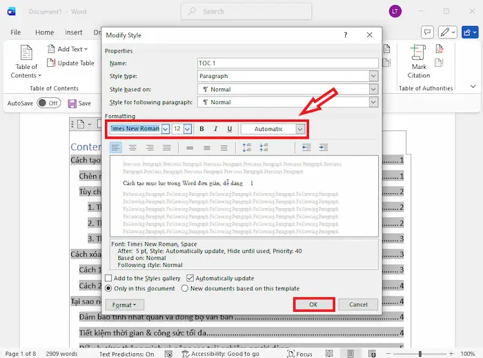 – Bước 6: Nhấn OK để hoàn tất việc lưu các thay đổi. Word lúc này sẽ tự động cập nhật mục lục với định dạng mới.