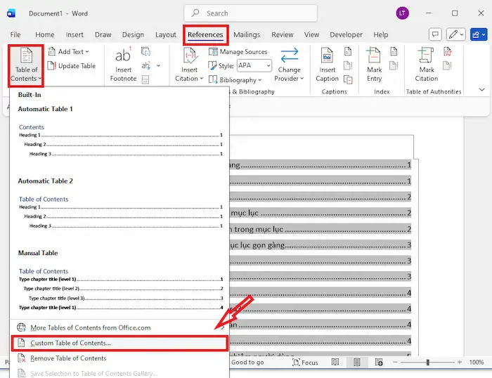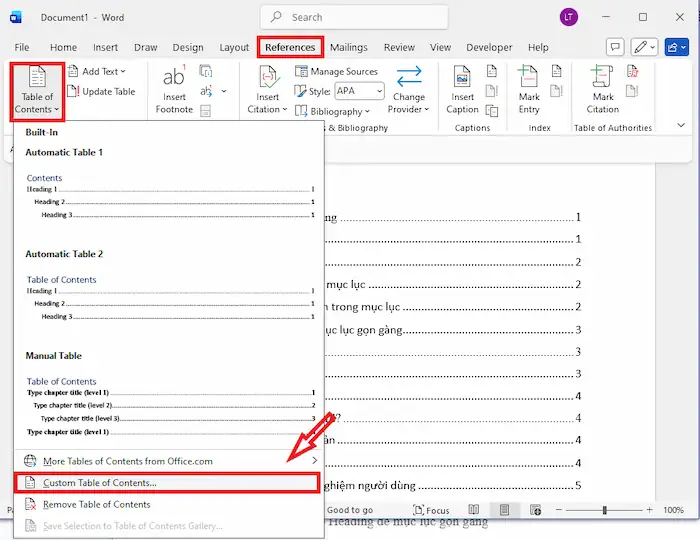 – Bước 1: Truy cập References >> chọn Table of Contents >> chọn Custom Table of Contents…