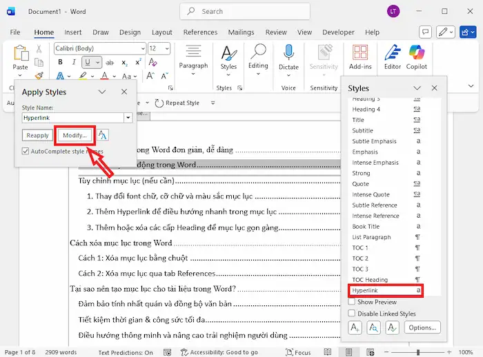 Sau khi triển khai cách tạo mục lục trong Word, bạn cũng có thể dễ dàng tùy chỉnh để mục lục phù hợp hơn với phong cách và định dạng của văn bản.