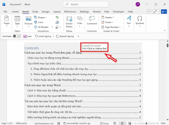 Người đọc không cần phải lăn chuột vất vả để tìm mục cần xem. Họ chỉ cần giữ phím Ctrl + Click vào bất kỳ tiêu đề nào trên mục lục, Word sẽ lập tức “nhảy” đến đúng vị trí của nội dung đó. Khi xuất sang file PDF, tính năng điều hướng này vẫn được giữ nguyên, tạo ra trải nghiệm cực kỳ chuyên nghiệp cho đối tác hoặc cấp trên.