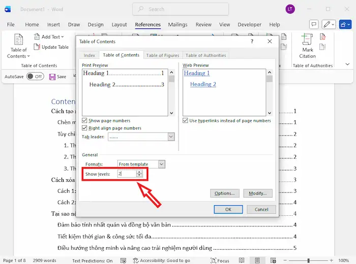 – Bước 2: Tại mục Show levels, nhập số cấp Heading muốn hiển thị (ví dụ 2 để chỉ hiện Heading 1 và Heading 2).