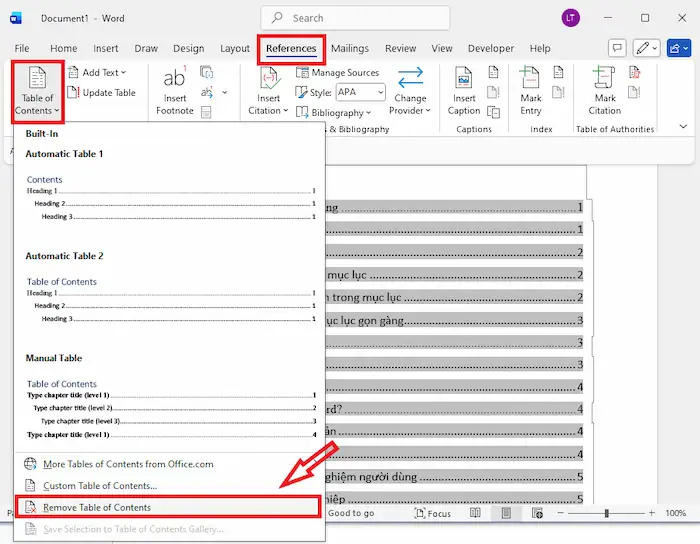 – Bước 3: Nhấn chọn Remove Table of Contents (Xóa mục lục). Mục lục lúc này sẽ được xóa hoàn toàn, các Heading và nội dung văn bản vẫn được giữ nguyên.