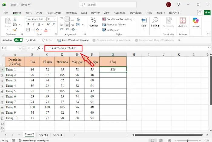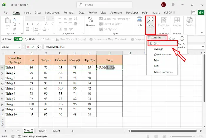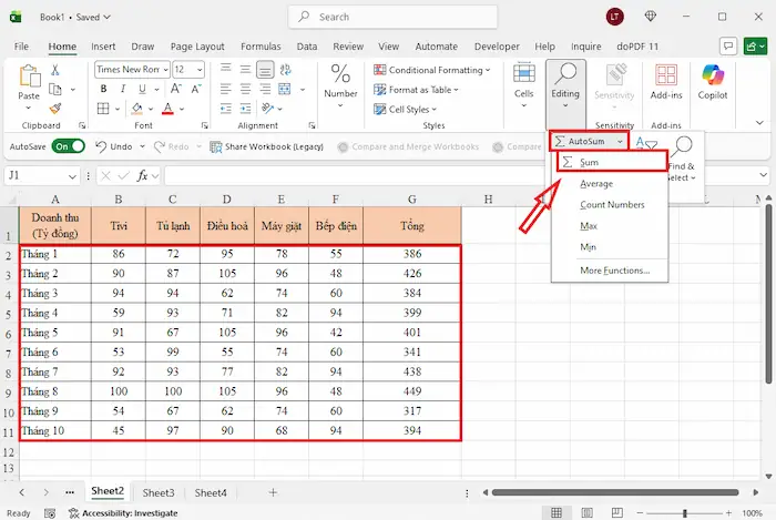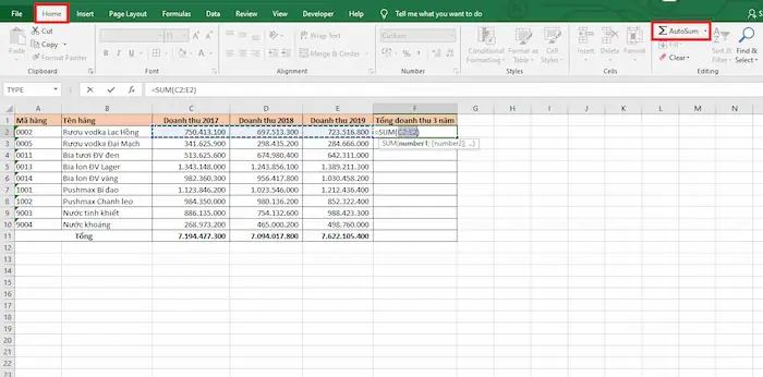 Nếu bạn không quen sử dụng phím tắt, Excel cũng đã thiết kế sẵn tùy chọn AutoSum ngay trên thanh công cụ để giúp bạn tính tổng hàng ngang chỉ với vài cú click chuột.
