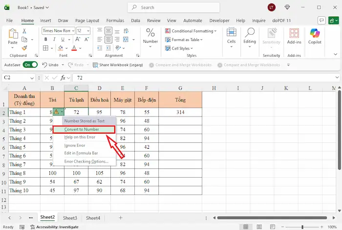 Bạn hãy bôi đen dải ô cần sửa, nhấn vào biểu tượng dấu chấm than vàng hiện ra bên cạnh và chọn Convert to Number. Ngay lập tức, các con số sẽ trở về đúng định dạng và kết quả tính tổng sẽ được cập nhật chính xác.