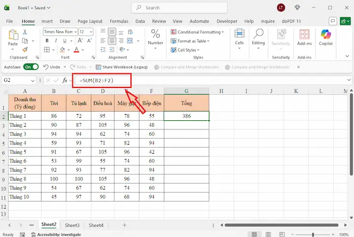 - Lưu ý khi chèn thêm cột mới: Nếu bạn chèn thêm một cột mới vào giữa dải ô đang tính tổng (ví dụ giữa dải B2:E2), Excel sẽ tự động cập nhật công thức để bao gồm cả cột mới đó. Tuy nhiên, nếu bạn chèn cột ở bên ngoài vùng tham chiếu, bạn phải tự cập nhật lại dải ô bằng tay.