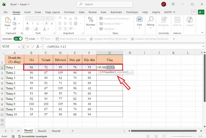 – Bước 2: Nhập: =SUM( >> dùng chuột bôi đen dải ô theo hàng ngang cần tính tổng (ví dụ: từ ô B2 đến F2).