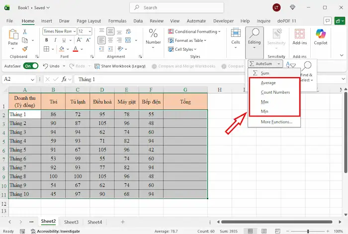 *Lưu ý: Ngoài tính tổng (Sum), khi nhấn vào dấu mũi tên nhỏ bên cạnh nút AutoSum, bạn có thể tính nhanh Trung bình cộng (Average), Đếm số (Count Numbers), hay tìm Giá trị lớn nhất/nhỏ nhất (Max/Min).
