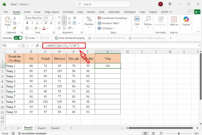 – Bước 2: Tiến hành nhập công thức tương ứng. Ví dụ: Để tính tổng các ô trong hàng ngang từ B2 đến F2 có giá trị lớn hơn 78, bạn nhập: =SUMIF(B2:F2, “>78”).