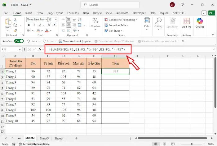 – Bước 2: Chọn vùng dữ liệu chứa số cần cộng trước, sau đó mới chọn vùng chứa tiêu chí và nhập điều kiện. Ví dụ: Tính tổng doanh thu các mặt hàng hàng từ 70 đến 95 tỷ trong tháng 1, bạn nhập: =SUMIFS(B2:F2, B2:F2, “>=70”, B2:F2, “<=95”)