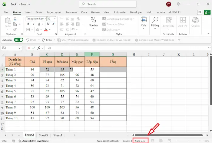 2. Xem nhanh tổng ở thanh trạng thái (Status Bar)