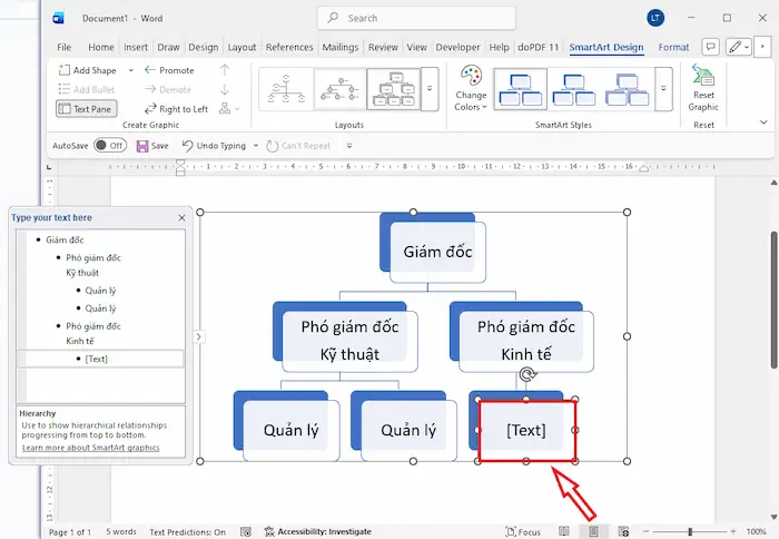 – Bước 4: Bạn có thể nhập trực tiếp vào các ô [Text] hoặc nhấn vào mũi tên nhỏ bên cạnh khối sơ đồ để mở bảng Text Pane. Nhập nội dung tại đây sẽ giúp sơ đồ tự động căn chỉnh kích thước chữ.