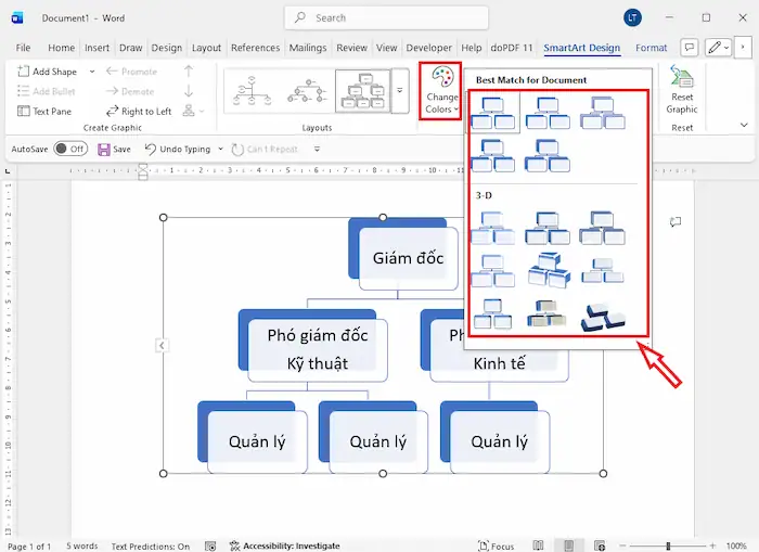 – Bước 5: Tùy chỉnh màu sắc và phong cách. Hãy nhấn chọn sơ đồ >> sử dụng thẻ SmartArt Design trên thanh Ribbon để: