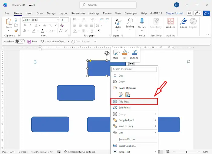 Nhấp chuột phải vào hình khối vừa vẽ và chọn Add Text (hoặc Edit Text). Sau đó, bạn có thể định dạng font chữ và màu sắc như văn bản bình thường.