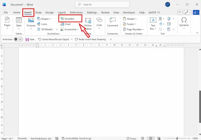 Word có những giới hạn về việc “chèn đối tượng vào trong đối tượng”. Nếu con trỏ chuột của bạn đang nằm bên trong một khung hình (Shape) hoặc một hộp văn bản (Text Box), nút SmartArt có thể bị ẩn đi.