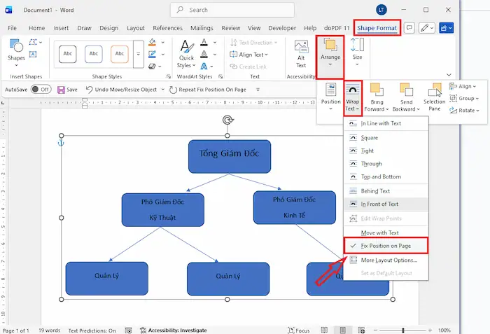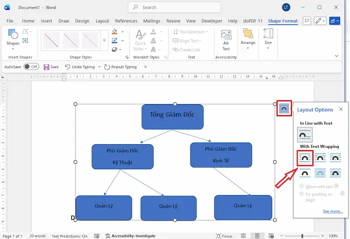 Đây là một trong những lỗi thường gặp khi vẽ sơ đồ trong Word. Nguyên nhân là do các hình khối đang được đặt ở chế độ mặc định gắn liền với dòng văn bản (In line with text). Khi bạn nhấn Enter hoặc thêm bớt câu chữ ở phía trên, Word sẽ coi sơ đồ như một ký tự văn bản và đẩy nó đi theo, dẫn đến tình trạng các khối hình và mũi tên bị tách rời, đè lên nhau hoặc nhảy sang trang khác.