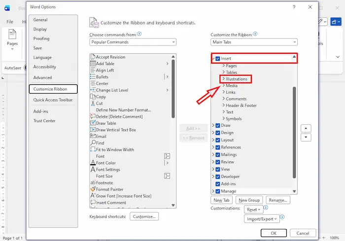 • Trong cột bên phải, hãy đảm bảo mục Insert và nhóm Illustrations đã được tích chọn.