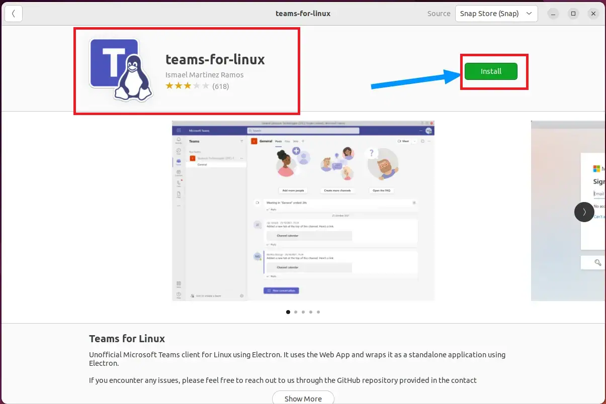 - Bước 3: Sau khi đã thực hiện xong bước 2, giờ đây bạn sẽ chỉ cần nhấn vào nút Install để cài đặt Microsoft Teams trên Linux.