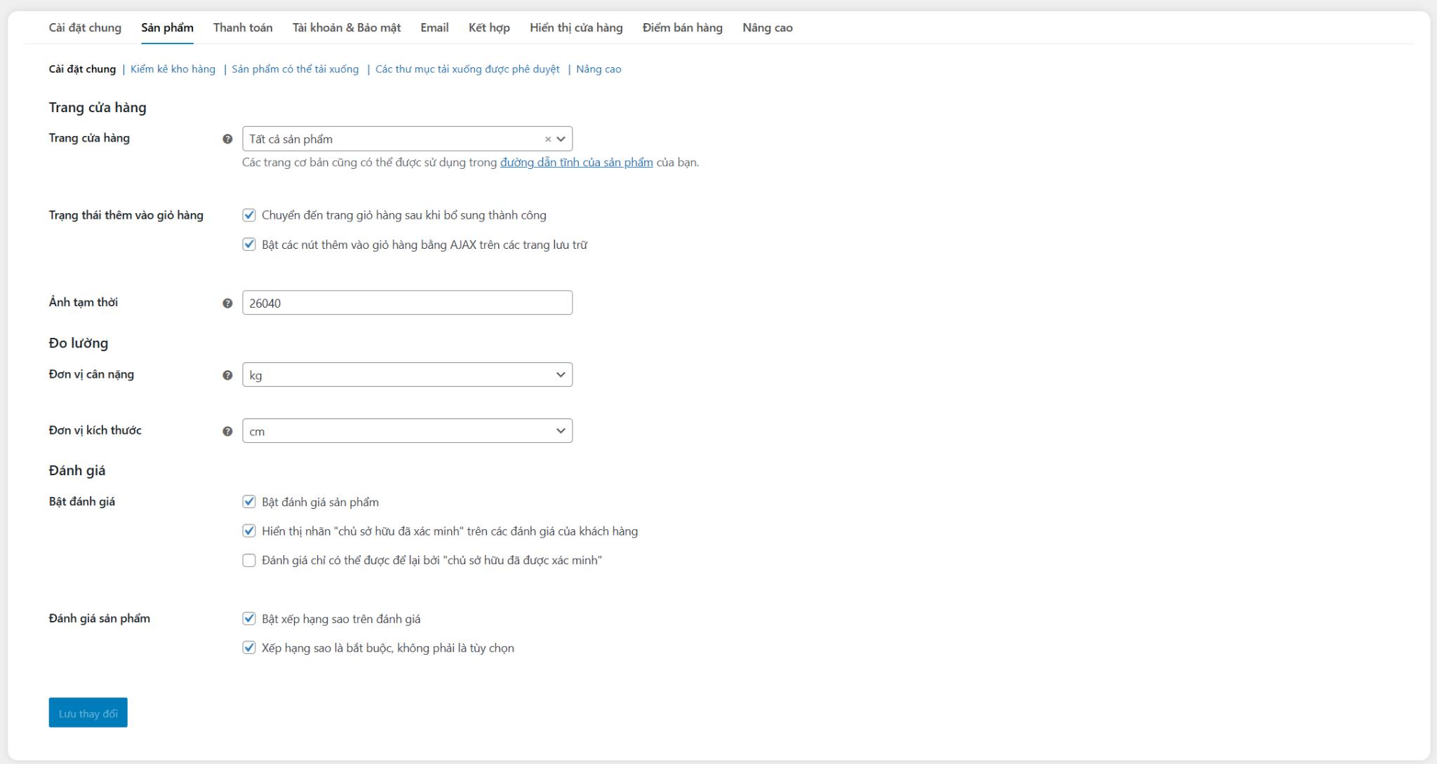 Tab “Sản phẩm” cho phép bạn tùy chỉnh mọi thứ liên quan đến sản phẩm được hiện thị và quản lý. Dữ liệu sản phẩm bao gồm đơn vị đo lường, đánh giá, chi tiết chứng khoán, phương pháp tải xuống và thậm chí các nút thêm vào giỏ hàng có thể được tùy chỉnh trong tab Sản phẩm: