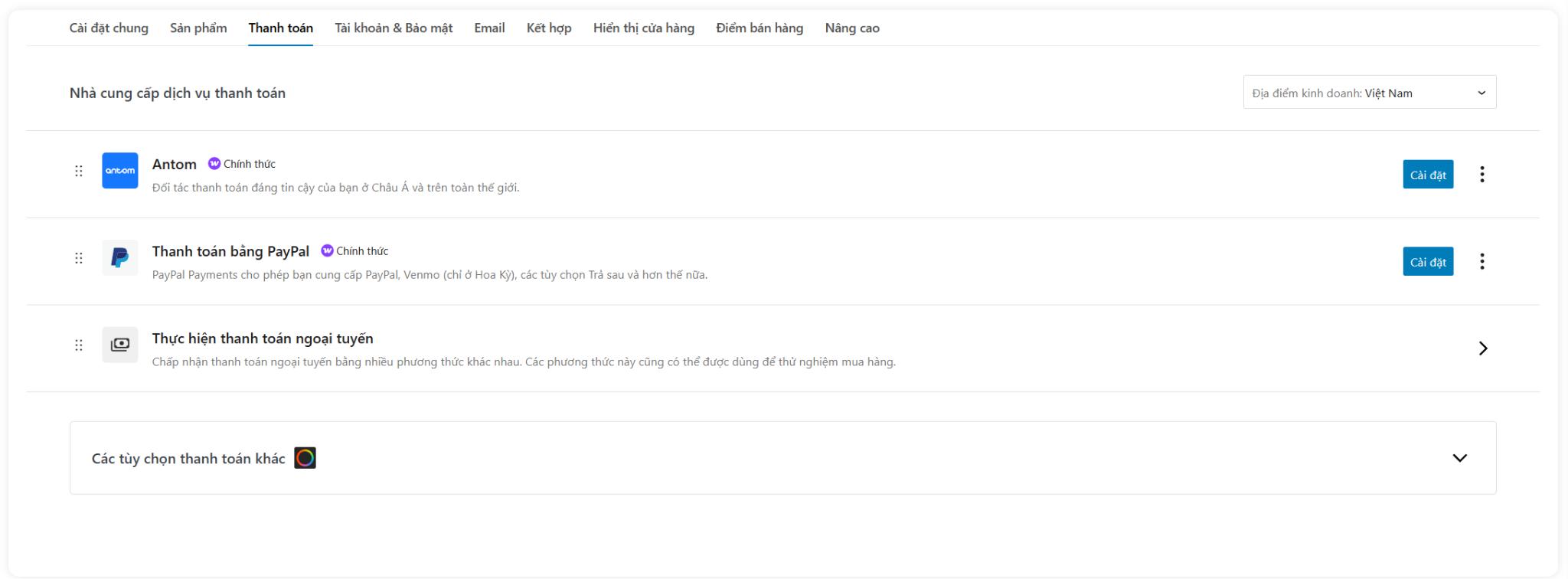 Tại tab “ Thanh toán” là nơi bạn quản lý các cổng thanh toán có sẵn trên cửa hàng của mình. Tại đây, bạn có thể kích hoạt và vô hiệu hóa bất kỳ tùy chọn thanh toán nào bạn muốn. Ngoài ra, bạn cũng sẽ tìm thấy các liên kết để đi đến trang cấu hình chi tiết cho từng nhà cung cấp dịch vụ thanh toán.