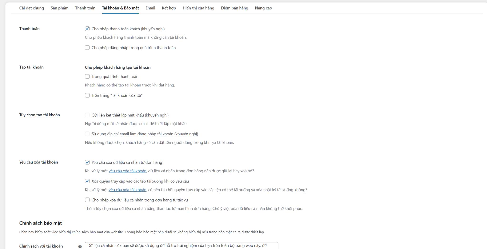 Bạn có thể thiết lập chính sách bảo mật và thanh toán, định cấu hình cách dữ liệu khách hàng sẽ được lưu trữ và giữ lại,…