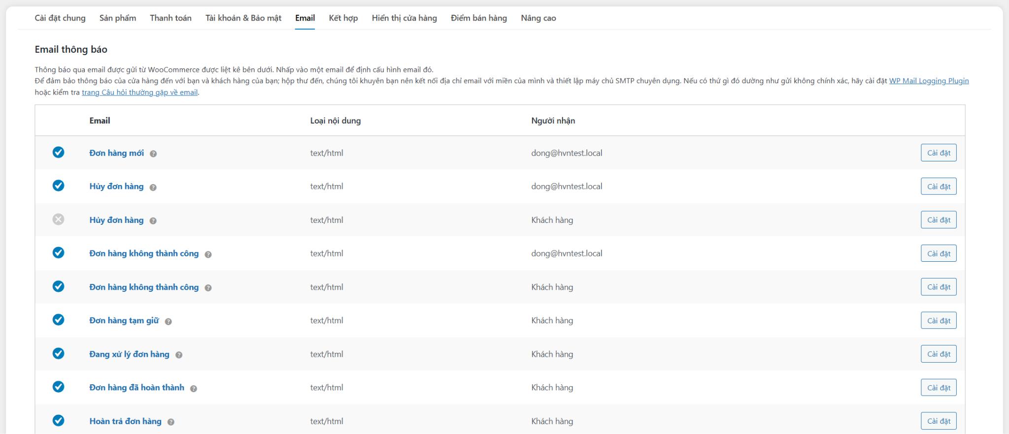 Ở đầu màn hình này, bạn sẽ tìm thấy một danh sách các thông báo email được gửi qua WooCommerce để phản hồi lại các kích hoạt cụ thể (chẳng hạn như đơn hàng mới, hủy đơn hàng). Bạn có thể nhấp vào bất kỳ email nào để bật / tắt chúng, thay đổi người nhận, tiêu đề và nội dung email.