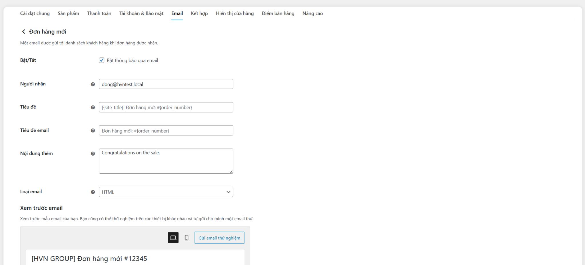 Trong tab Email, bạn có thể tùy chỉnh toàn bộ hệ thống thông báo tự động gửi đến khách hàng và quản trị viên
