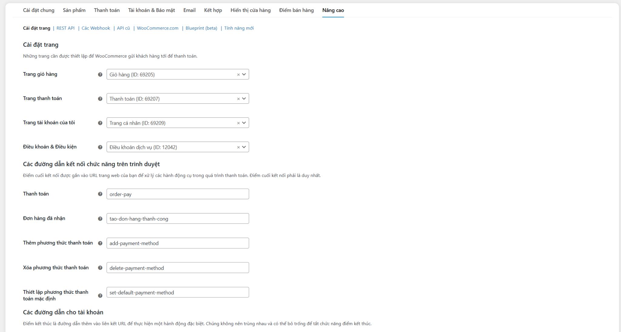 Cuối cùng, trong tab “Nâng cao” là khu vực dành cho các thiết lập kỹ thuật cấp thấp. Tại đây, bạn có thể kích hoạt API REST, định cấu hình khóa truy cập (key), ứng dụng và webhooks để kết nối WooCommerce với các hệ thống khác.