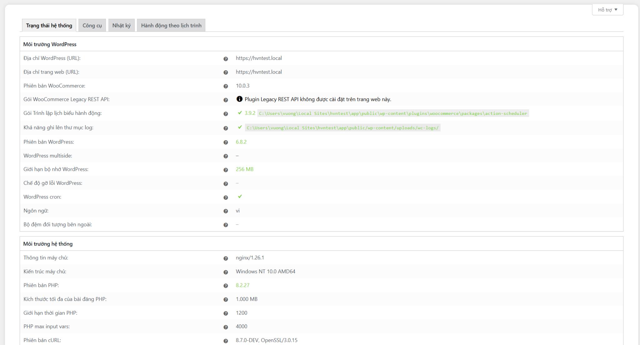 Tại đây bạn có thể tìm thấy toàn bộ hệ thông tin kỹ thuật về môi trường hoạt động của website, như phiên bản WooCommerce, PHP, MySQL của bạn, phiên bản giới hạn kích thước, đăng nhập, và nhiều hơn nữa.