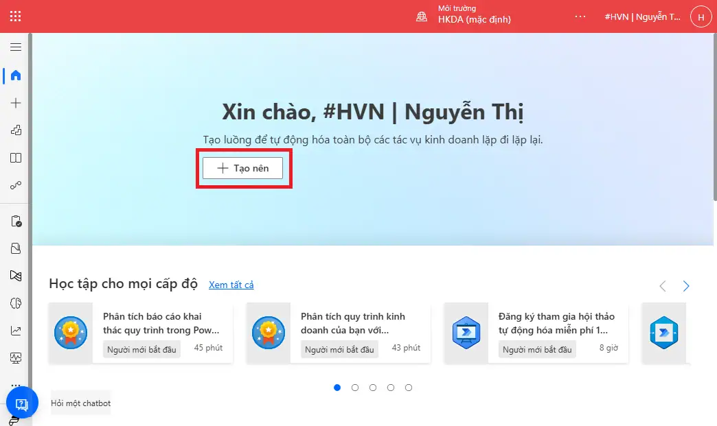 - Bước 2: Chọn “Tạo nên” (Create) và chọn “Luồng đám mây tự động” (Automated cloud flow) hoặc “Luồng đám mây tức thời” (Instant cloud flow).