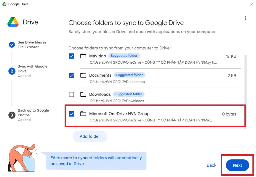 - Bước 6: Đảm bảo đã chọn tùy chọn “Đồng bộ hóa với Google Drive” (Sync with Google Drive) hoặc tương tự cho thư mục OneDrive đã chọn.