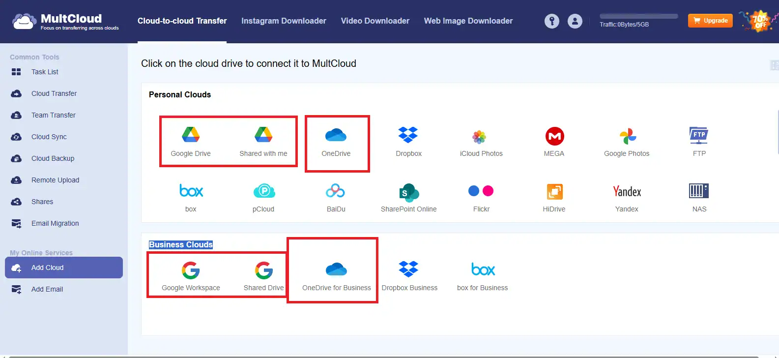 Do đó, chúng tôi sẽ hướng dẫn bạn cách chuyển dữ liệu từ OneDrive sang Google Drive với sự hỗ trợ của công cụ MultCloud như sau: