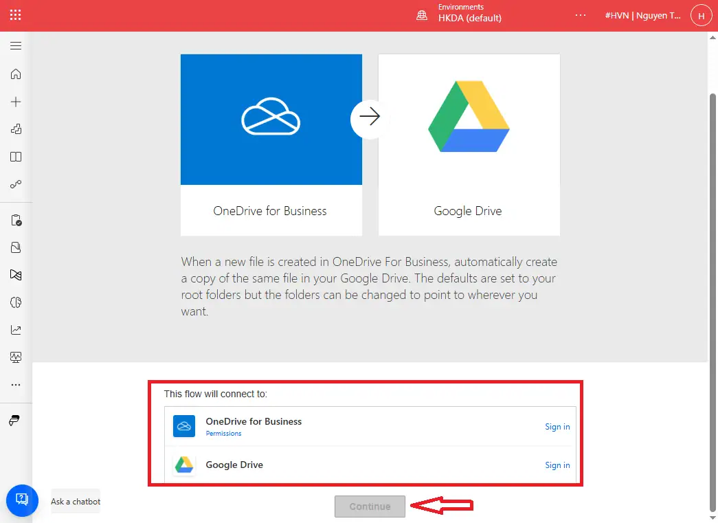 - Bước 4: Bạn sẽ cần cung cấp thông tin kết nối đến cả OneDrive và Google Drive tiếp đến chọn Continue.
