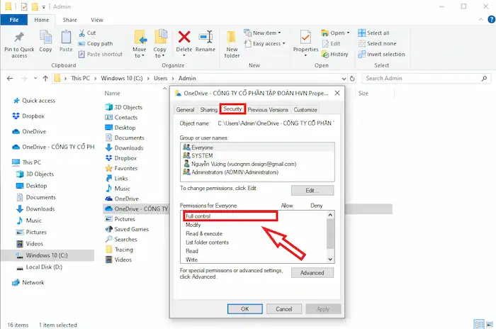 - Cung cấp đủ quyền truy cập cho tài khoản người dùng, đơn giản bằng cách click phải chuột thư mục OneDrive >> Properties >> Security >> Kiểm tra quyền.