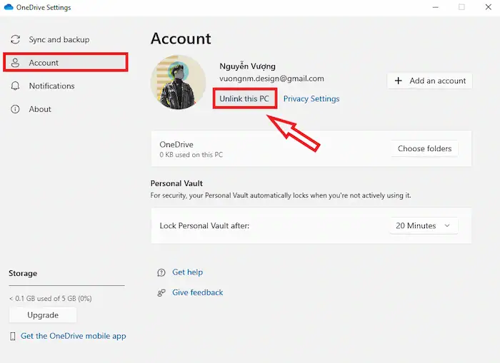– Bước 3: Nhấp chọn Unlink this PC (Ngắt liên kết máy tính này) và xác nhận khi hệ thống hiển thị câu hỏi Unlink account on this PC.