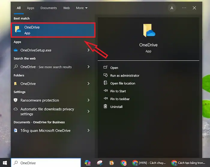 – Bước 1: Tìm và mở ứng dụng OneDrive từ menu Start.