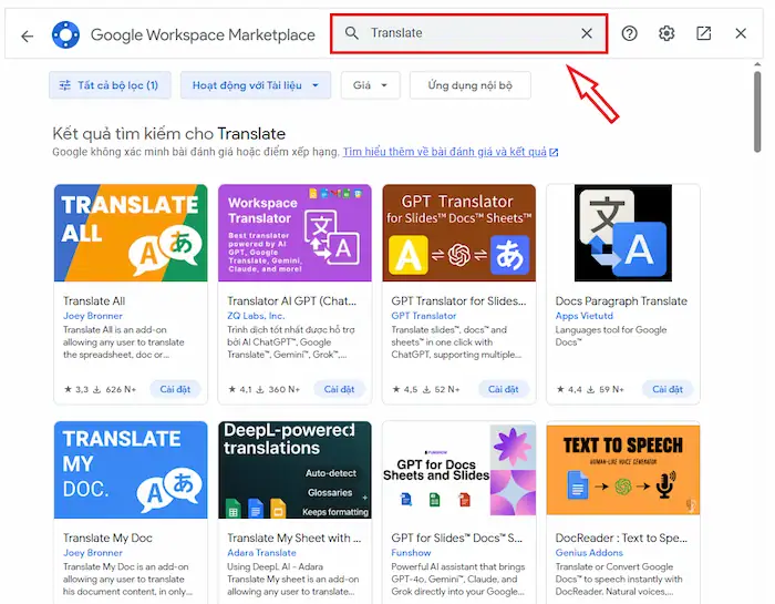 – Bước 2: Tìm từ khóa “Translate” và cài đặt các tiện ích như Translator AI GPT hoặc Docs Paragraph Translate.