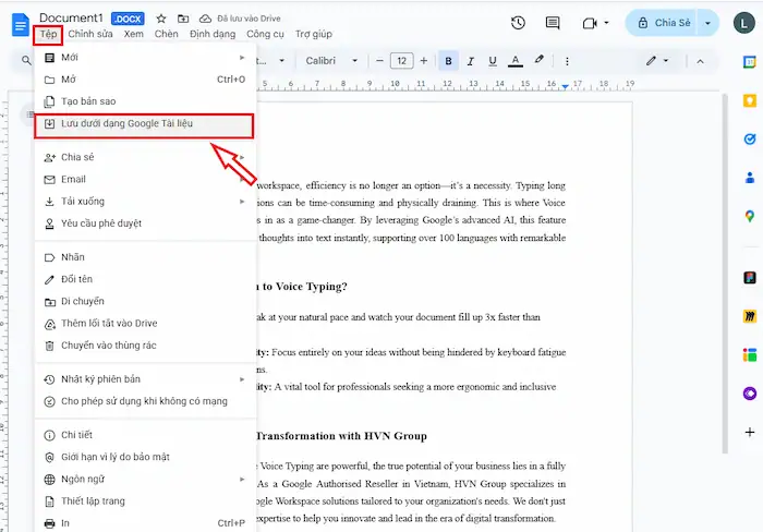 – Bước 2: Chọn Lưu dưới dạng Google Tài liệu (Save as Google Docs) để chuyển đổi định dạng cho file Word.