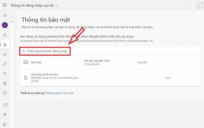 Bước 2: Click chọn Bảo mật (Security) và tìm mục Thêm phương thức đăng nhập (Add login methods).