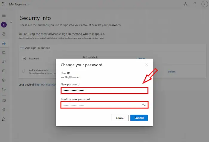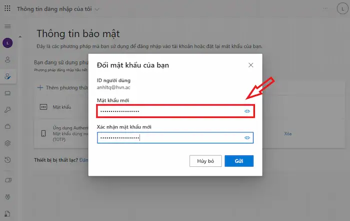 Bước 8: Nhập mật khẩu cũ và tạo một mật khẩu mới theo các tiêu chí của Microsoft (tối thiểu 8 ký tự, kết hợp cùng chữ hoa, chữ thường, số và ký tự đặc biệt) >> nhấn Gửi để hoàn tất thay đổi.