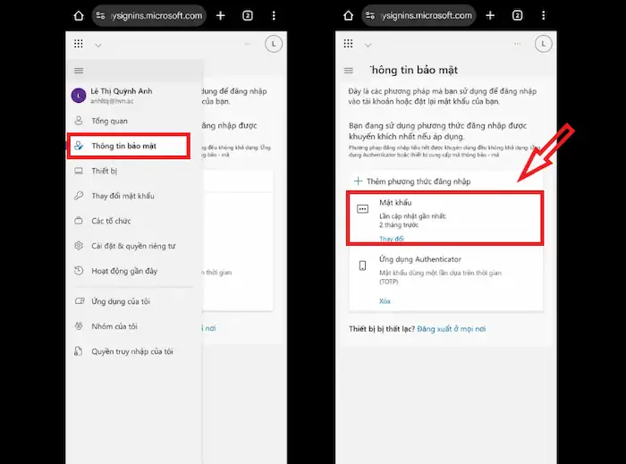 Bước 6: Bạn hãy nhập mật khẩu đang dùng, sau đó tạo mật khẩu mới. Mật khẩu này cần thỏa mãn các tiêu chí bảo mật của Microsoft (tối thiểu 8 ký tự, có chứa chữ hoa, chữ thường, số và ký tự đặc biệt).