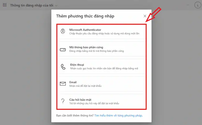 Bước 3: Tùy chọn phương thức bảo mật thứ 2 mà bạn muốn >> làm theo hướng dẫn để thiết lập tính năng này.