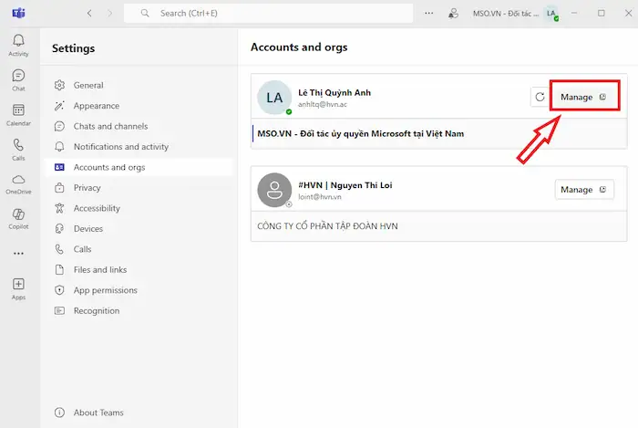 Bước 4: Tại cửa sổ Cài đặt, chọn Tài khoản (Account) >> tùy chọn tài khoản bạn muốn thay đổi mật khẩu >> nhấn chọn Manage (Quản lý).