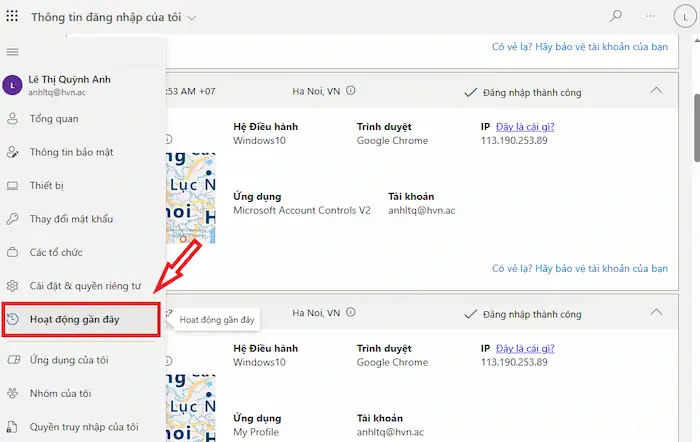 – Bước 1: Truy cập Microsoft Account và nhấp chọn mục Hoạt động gần đây.