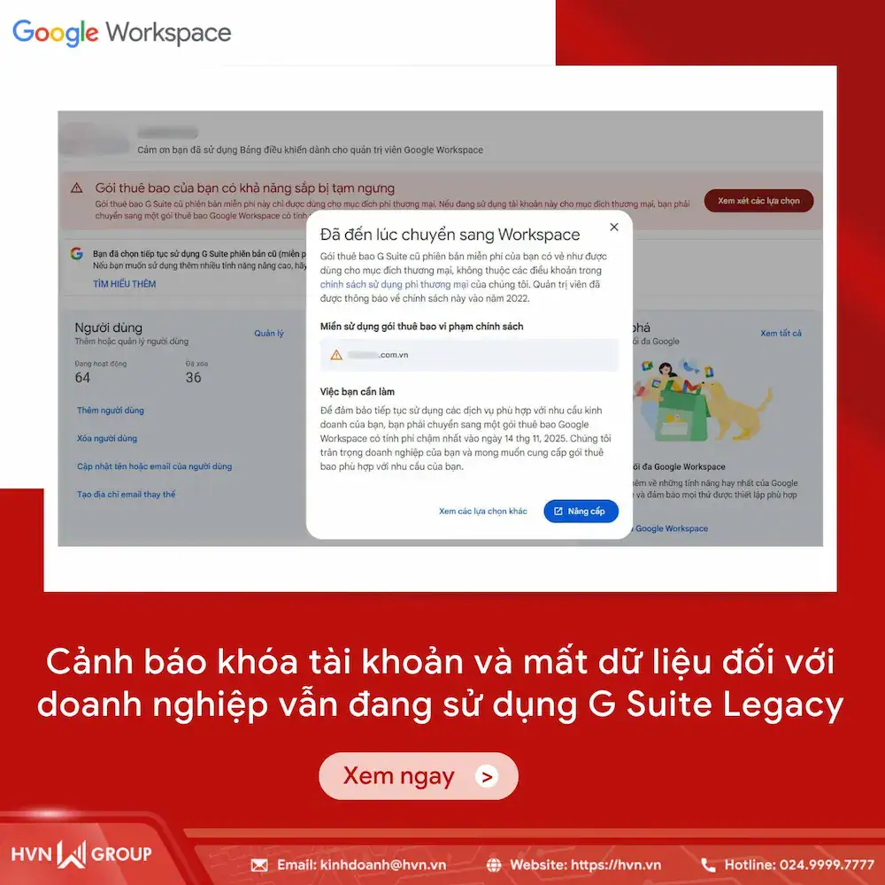 Hãy hành động ngay hôm nay! Liên hệ với HVN — Đối tác chính thức của Google tại Việt Nam — để được tư vấn và hỗ trợ nâng cấp chuyên nghiệp. Chúng tôi cam kết quá trình chuyển đổi diễn ra nhanh chóng, an toàn và đảm bảo giữ nguyên vẹn mọi dữ liệu của doanh nghiệp.