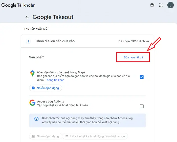Mặc định, Google sẽ chọn tất cả các dịch vụ. Tuy nhiên, để tiết kiệm thời gian và dung lượng máy tính, bạn nên lọc lại: